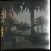 1950. Paris. "St Michel La Slava" gata, kvällsbild. En man och en kvinna sitter på uteserveringen.
