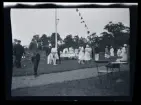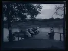 Ett stort sällskap fikar vid ett bord, utomhus bland tallar. Fotografens anteckning på negativet "Mårtensson"