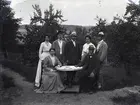 "1905. Far omkring 60 år mor -51. Selma." "Sittande vid bordet, Elemina och Johan Henrik Sahlberg. Selma stående längst till vänster."