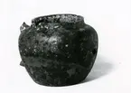 "Info från fotobeskrivning" "Glaserat kokkärl i lergods defekt."