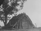 Gamla båtar, barktäckta och uppsatta på stolpar tjänande till nätbod.