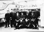 Bilden visar underofficerare och underbefäl ombord på logementsfartyget Stockholm under skjutskolan i Bollösund år 1899.