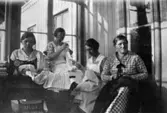 Fyra personer sitter på en gräsmatta, Stretereds skolhem cirka 1920. Från vänster: 1. Hilda Olsson. 2. Irene. 3. Gunnar och 4. Hilda. Hilda Olsson (1887-1973, år 1923 gift Sandberg) arbetade som husa hos Håkan Jönsson som var föreståndare på Stretereds skolhem.