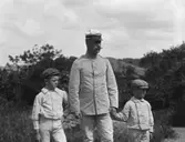 Vommedal Östergård 2:41 "Olas" cirka 1950. Till höger i bakgrunden ses traktorgaraget på Olas väg. Kusinerna leker. Från vänster: Annika Bjerrhede f. 1948, Christer Månsson f 1947 och Roger Sandberg f. 1948.