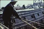 Isbrytaren SANKT ERIK på Stockholms Reparationsvarv. Varvsarbetare vid skrovsidan i torrdockan på Beckholmen.
