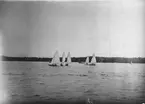 Från KSSS volontärkappsegling på Bogesundsbanan 20 augusti 1916. Närmast med segelnummer 8 plymsnäckan IVERNA. På avstånd längst t h med segelnummer 11 ses 16 kvm snäckan KAMRATEN. IVERNAs och KAMRATENs identitet framgår av andra fotografier från seglingen i KSSS årsbok 1917 s 172 f. Båten närmast efter IVERNA har inte kunnat identifieras.