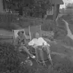 Sommaren 1955. Veronika i vit hätta med rosor. Judit Abrahamsson i klänning i franska flaggans färger. Sparkdräkten i ljusgult stickad av Birgit, babydockan ärvde den.
