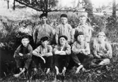 "Spinnpojkar" sitter i fabriksparken vid Anderstorps fabrik (August Werner), 1919-1920. Överst fr v: Bruno Bengtsson, Folke Norén, Ernst Nilsson. Nedre fr v: Eskil Bodlund, Elis Andersson, Gustav Svensson-Ek, Joel Zachrisson och Gunnar Rasmusson.