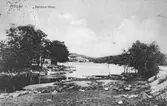 "Stensjöns Utlopp" (Mölndalsåns utlopp ur Stensjön) sett från södra stranden av utloppet mot Gunnebobro i nordost, cirka 1930. Till vänster ses Sjövillans brygghus och garage.