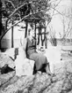 Ett arbetslag har samlats för en icke helt spontan fotografering framför det gamla magasinet invid Vreta kloster kyrka. Sannolikt utförde de restaureringsarbeten på byggnaden, möjligtvis i samband med ny funktion som stenmuseum.