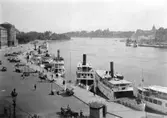 Hamnbild från Strömkajen i Sthlm. Foto 4.6 1969. Fartyg från v. m/s Tynningö, m/s Ramsö, m/s Havsörnen, m/s Sunnan, m/s Rödlöga, m/s Rånö.