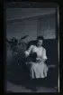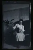 Porträtt av en kvinna i vid svart klänning som sitter på en stol. Hon har lockar i håret och bär en tunn vit veckad mössa med svart band.