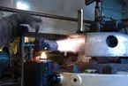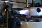Tröskning i Ågård, Tvååker. Tröskning med fotogenmotor s k tändkulemotor, 1910. Tröskfolket, med barn och vuxna, är samlat omkring maskineriet. På väggen till ladan bakom folket sitter ett stort anslag.