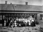"Kalasfolk" i olika åldrar samlade framför en mycket långsträckt glasveranda med två ingångar. Bertha Engström (fotografens mor) sitter som tredje person från vänster. En man och fyra barn ligger främst, direkt på stenläggningen. Huset har en smal figursågad dekorlist under takfoten och ett litet takfönster mellan skorstenarna. Meddela oss gärna om du vet vad gården heter! (Bilden har diverse skador)