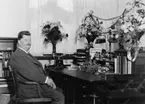 Byrådirektör Birger Kreutz, förre chefen för Postens Reklamationskontor, avgår med pension och uppvaktas av Kommersiella byråns personal.Öktr Georg Sjöblom, postdirektionen i Sth D, lämnar en gåva.