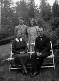 Två kvinnor och ett barn i trädgårdssoffa.
