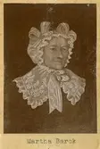 "Fru Martha Barck." "Tullförvaltaren Bengt Barck f 1676 d 1751. Tullförvaltare i Warberg, Strömstad, Christinehamn. Kyrkoherden Johan Reinhold Barck f i Warberg 1712. Kyrkoherde i Okome, Köinge, Svartrå i Halland d Okome 1771. Martha Barck f i Okome halland d 24 mars 1758. Död i Uddevalla hus 164 6 april 1842. Gift med sin kusin Anders Barck f i U-a 31/5 1762, handf. i U-a död 15/6 1825 son af Tullförv. i u-a Lars Anders B f1716 i Warberg".