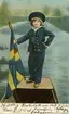 Vykort på militärt område i Karlskrona och även en sjöman som står och pekar mot fotografiet.