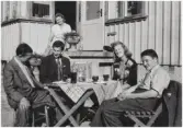 "Karantänsförläggning" på Kvarnbyskolan för överlevare från koncentrationsläger i Tyskland och Polen 1945. Skolan fungerade under denna sommar som beredsskapssjukhus. Fyra personer, tre män (flyktingar) och en kvinna, sitter och fikar i trädgårdsmöbler utanför ett bostadshus. En kvinna (vårdpersonal?) sitter i trappan som leder in till huset. Längst till vänster ses Abraham Frischer (1923 - 2009). Samtliga ler och verkar ha trevligt tillsammans.