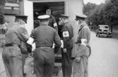 "Karantänsförläggning" på Kvarnbyskolan för flyktingar från koncentrationsläger i Tyskland 1945. Röda Korsets personal som lastar ur förnödenheter från en lastbil.