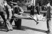 "Karantänsförläggning" på Kvarnbyskolan för flyktingar från koncentrationsläger i Tyskland 1945. Manlig flykting blir buren på bår av Röda Korsets personal.