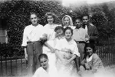"Karantänsförläggning" på Kvarnbyskolan för flyktingar från koncentrationsläger i Tyskland 1945. Tre pojkar, tre flickor och tre sköterskor.