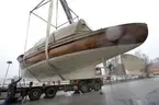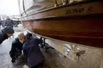 Styrbordssidans aktre pollare. Beslaget är skruvat uppifrån ned i skarndäcket utan avbärande list under och har därför ryckts upp något.