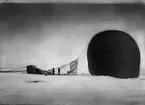 Lägret vid "Örnens" landningsplats. Till vänster gondolen, till höger tältet. Mellan dem skymtar båten. I tältet ses proviant och kokkärl. I mitten kokapparat och till vänster en proviantkorg. Framtagning av bilderna gjordes av docent John Hertzberg år 1930 på Fotografi, Tekniska Högskolan.