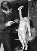 Bildhuggare Reinhold Pettersson på arbetsplatsen med en konsol huggen i sten