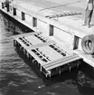 Simtävling i Systraströmmen. Bilden är tagen vid målet. Simmare och fuktionärer står på målflotten, funktionärer och åskådare finns i båtar runt målet.