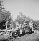 Skara. Stadsträdgården. Konservator Beda Westmans 50-årsdag firas på museet. Foto: Ivar Söderqvist 26/4 1944. Styrelsen för Fornminnesföreningens arbetsutskott, utskottets tidigare ordförande Rektor Welin, fornminnesföreningens vaktmästare och dess konservator, Fru Westman, samlade å museét i Skara för firande af den sistnämndas 50-års dag. Sittande från vänster: Kassör Hjortén, Adjunkt Carlsson, Landsantikvarie Ullenius, Ryttmästare Ekberg, Fru Westman, Rektor Welin. Stående: Vaktmästare Johansson.