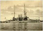Denna fartygsporträtt visar pansarskeppet Oden efter ombyggnad 1915 på Karlskrona redd. De två skorsten har ersatts med en.