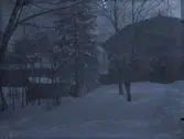 Korsningen Rygatan-Norra Forsåkersgatan i Mölndals Kvarnby, omkring 1975-1980. Till vänster Forsåkersgatan 21. Närmast till höger portvaktsstugan som blev tvättstuga. I bakgrunden till höger ses Forsåker Kronogården.