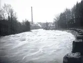 "1934. 2. Högt vattenstånd . Längs fabriken." "Munkedalsälven. Bruksvägen. fr.v. sorteringssalarna, portvaktstugan och huvudkontoret."