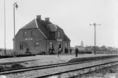 Stationen. Mitt för stationshuset står en T-semafor med så kallade gallerverksvingar. Signalen visar kör varsamt. Till vänster i bild finns en ställbock Ställbockar användes för manövrering av enklare mekaniska säkerhetsanläggningar, där växlar och spårspärrar är lokalt omläggbara och där signalerna var av typen semafor.
