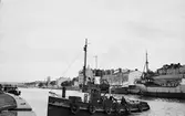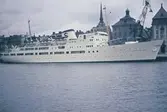 Fartyg vid Skeppsbrokajen. Södra Blasieholmshamnen i bakgrunden med Grand Hotell och Nationalmuseum.