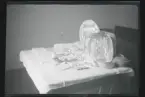 Skioptikonbild från Institutionen för fotografi vid Kungliga Tekniska Högskolan. Använd av professor Helmer Bäckström som föreläsningsmaterial. Bäckström var Sveriges första professor i fotografi vid Kungliga Tekniska Högskolan i Stockholm 1948-1958. Autokrom. Stilleben med motiv av tulpaner och choklad. Negativ av J. Hertzberg överförda till gelatinreliefer på Agfa Anaglyffilm, infärgade med pinatypiefärger.