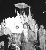 Kökspersonal samlade vid julgran med tända ljus och en tomte, iförd långt skägg och träskor, som sitter bland kvinnorna. Lokalen är okänd. Vykort.