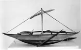 Bilden visar en utriggare kanu seglande på havet. I bakgrunden syns fregatten Vanadis med satta segel. Däremellan befinner skonaren av kung Kabua.
