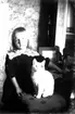 Två flickor, klädda i folkdräkt, står ute i trädgård med två katter vid benen, sannolikt i Dalarna
