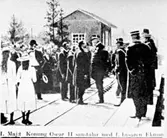 Oscar II inviger Lidköping-Skara-Stenstorps Järnväg, L.S.S.J. den 19 november 1874. Reprofotografi av teckning eller etsning.