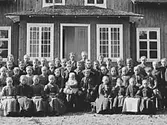 Enligt fotografens anteckningar: "Önnebacka från 1910? Folkskollärare V. Lindqvist, Gottfrid Vinberg Mö skolrådsledamot och lärarinnan Fröken Hanna Larsson."