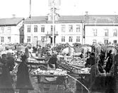Enligt fotografens noteringar: "Torgdag i Munkedal vid lilla Järnvägsstationen. H. Trogen vid sitt stånd längst till vänster. Grönsaksstånd m.m."