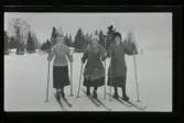 "Astrid Andersson, Ebba Larsson, Ebba Andersson, Fogelstad." Tre glada kvinnor på skidor.