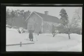 "Myrberg, Karin Jonsson." En kvinna på skidor framför ett hus. I trädgården sitter fler personer.