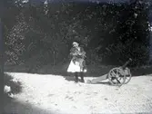 Soldater ur Svea artilleriregemente A 1 uppställda på fält med 8,4 cm kanon m/1881, i bakgrunden föreställare. Platsen troligen Ladugårds gärde.