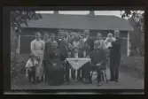 "Axels mor Maria 70 år." Anna Maria Larsdotter (f.1856) sitter vid ett bord fullt av gratulations-blommor.