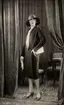 Modell klädd i dubbelknäppt kappa, pumps, hatt och handskar. Lutar sig mot stentavla.