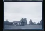 En man sågar ett trästycke och en pojke hugger med en yxa, på gården vid en stuga.