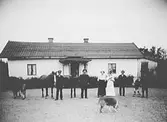 FAMILJ SITTER VID BORD I PORT OCH DRICKER KAFFE. I BAKGRUNDEN ETT TVÅVÅNINGS BOSTADSHUS. ETT BARN ÄR KLÄTT I SJÖMANSKOSTYM.